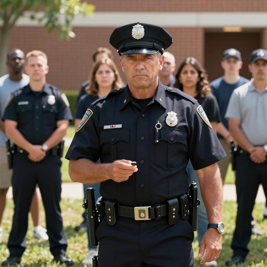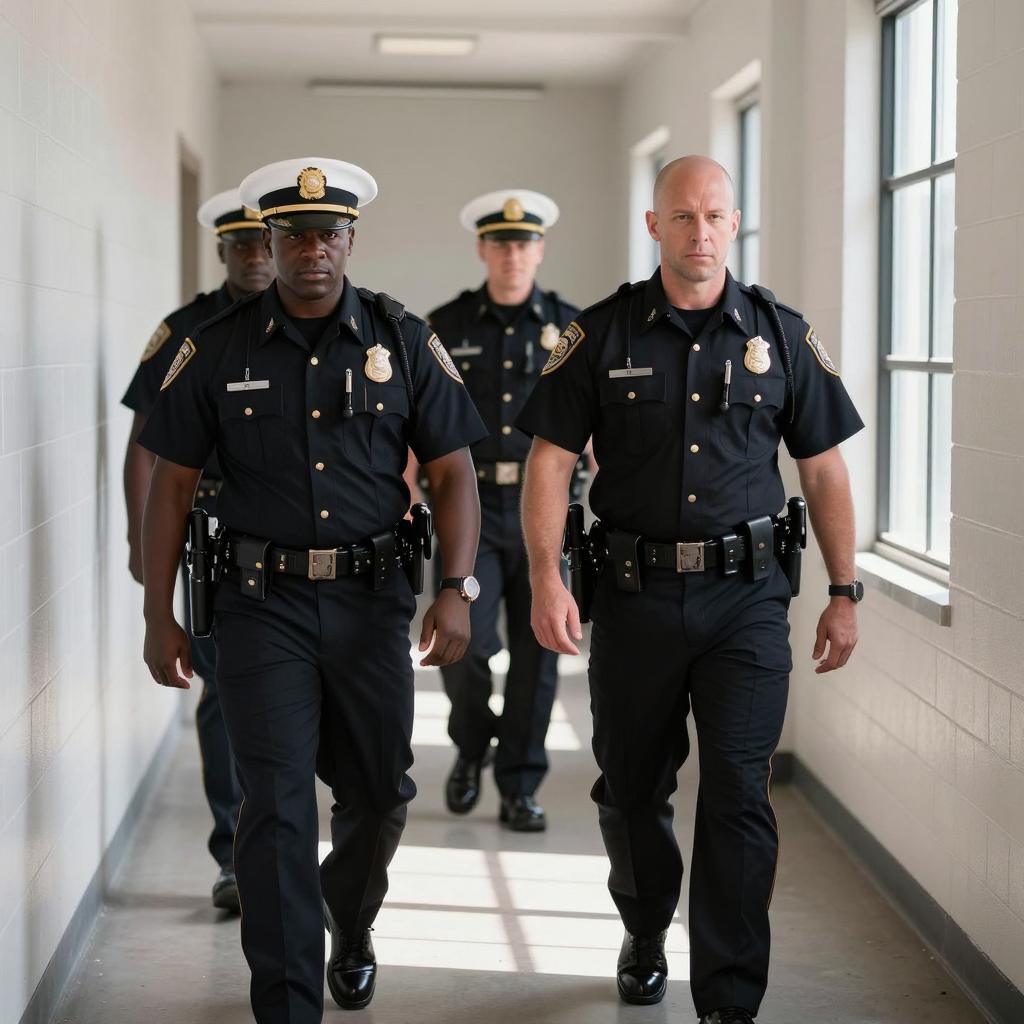 Photograph of four men in a dimly lit doorway at night. Three police officers in dark uniforms and caps stand to the left and right, holding rifles. One bald man in a black suit and tie stands in the center, hands in pockets. Shadows cast on the ground.
