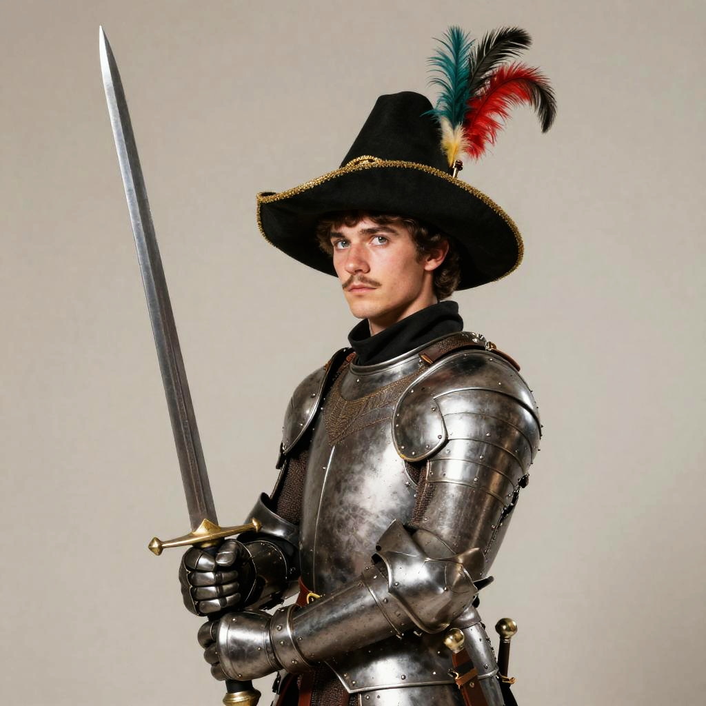 High resolution, high quality, high detail, soft lighting, cinematic lighting, realistic, DSLR, bokeh, studio quality, film grain, panorama, film grab of a young landsknecht wearing a large hat with colorful feather plumes, plate armor, black shirt, moustache, holding a very long sword, standing, simple background, 80s fantasy movie
