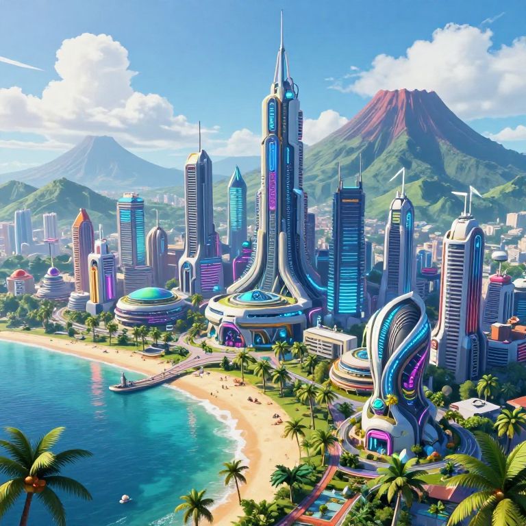 Hoenn inspired futuristic cityscape with towering architecture surrounded by tropical beaches and volcanic mountains, intricate details, neon lights reflecting off water, cyberpunk elements blended with natural beauty, bright and vivid colors.