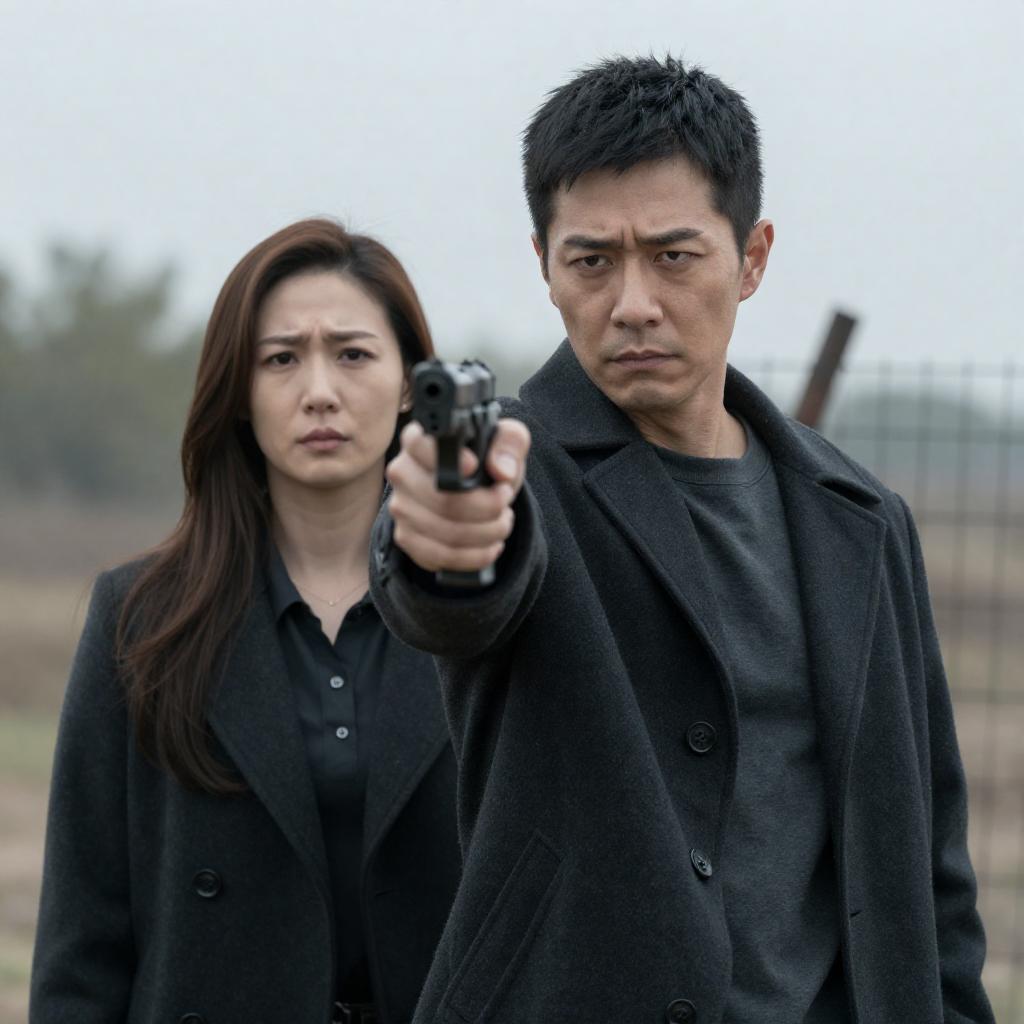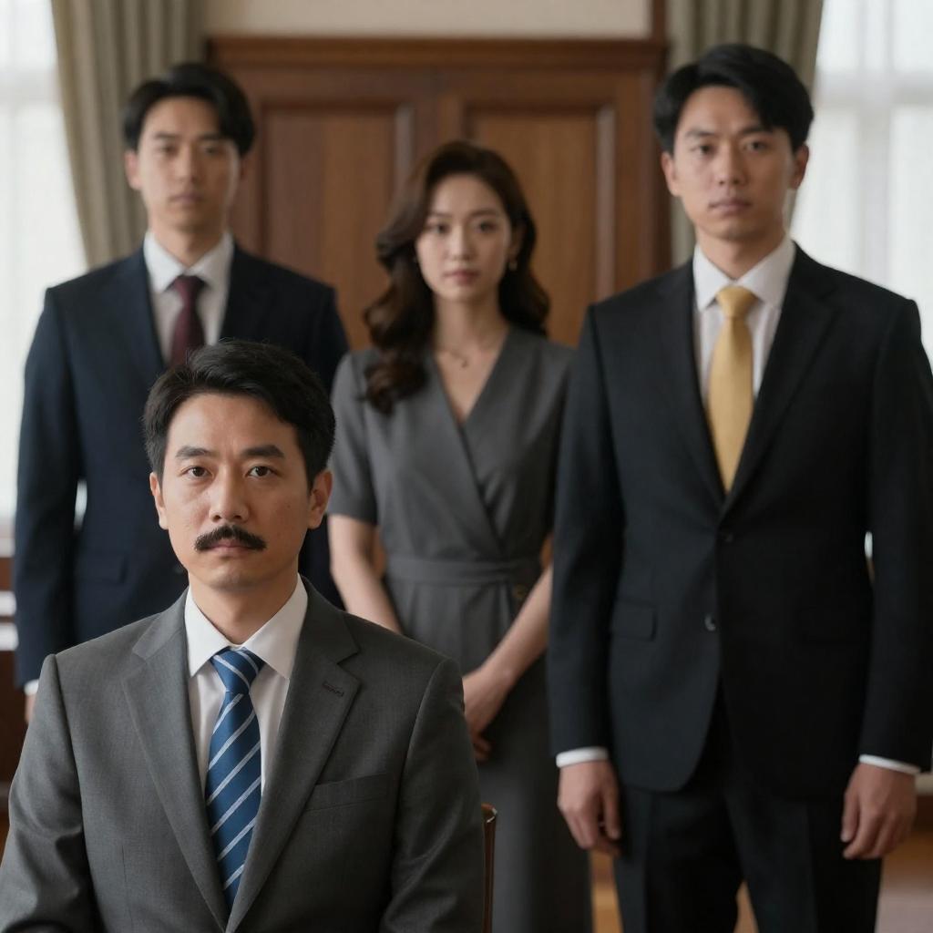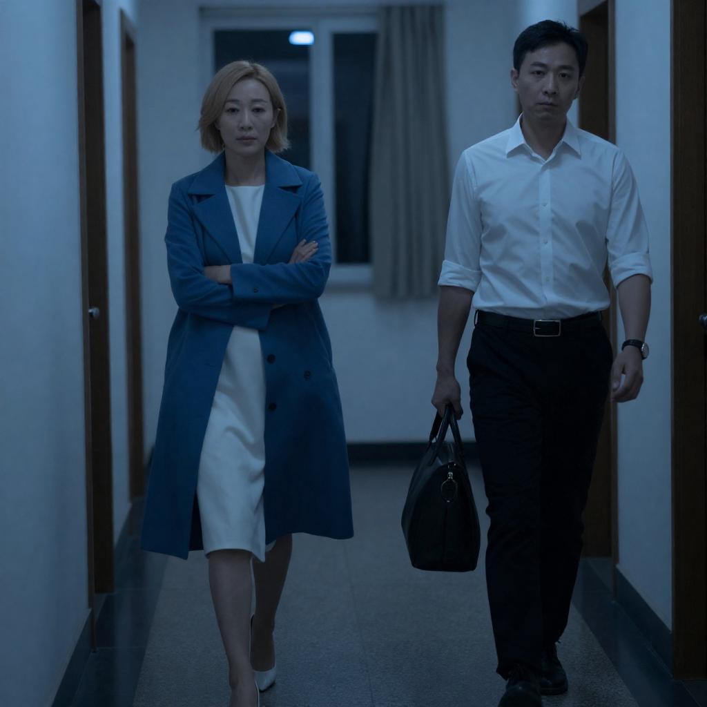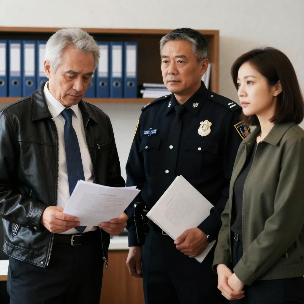 Three people walking in a cemetery. Middle woman in brown suit with brown hair, carrying brown bag. Left woman in beige outfit with glasses, holding brown bag. Older man with white hair in black coat, right. Greenery and tombstones in background. Middle woman looks forward, left woman looks down, older man looks down, holding hands together.