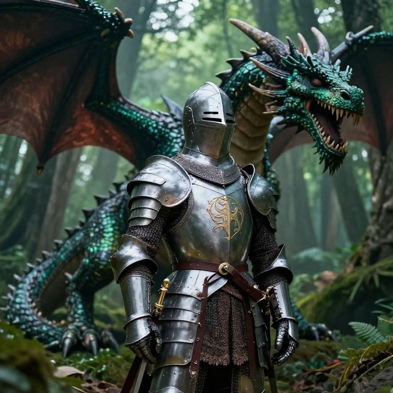 A heroic knight stands boldly in a lush green forest, clad in intricate armor, with a fearsome dragon looming behind him. The vivid details of the dragon's scales and the knight's attire evoke a sense of adventure and fantasy, creating an epic scene straight from a legendary tale.