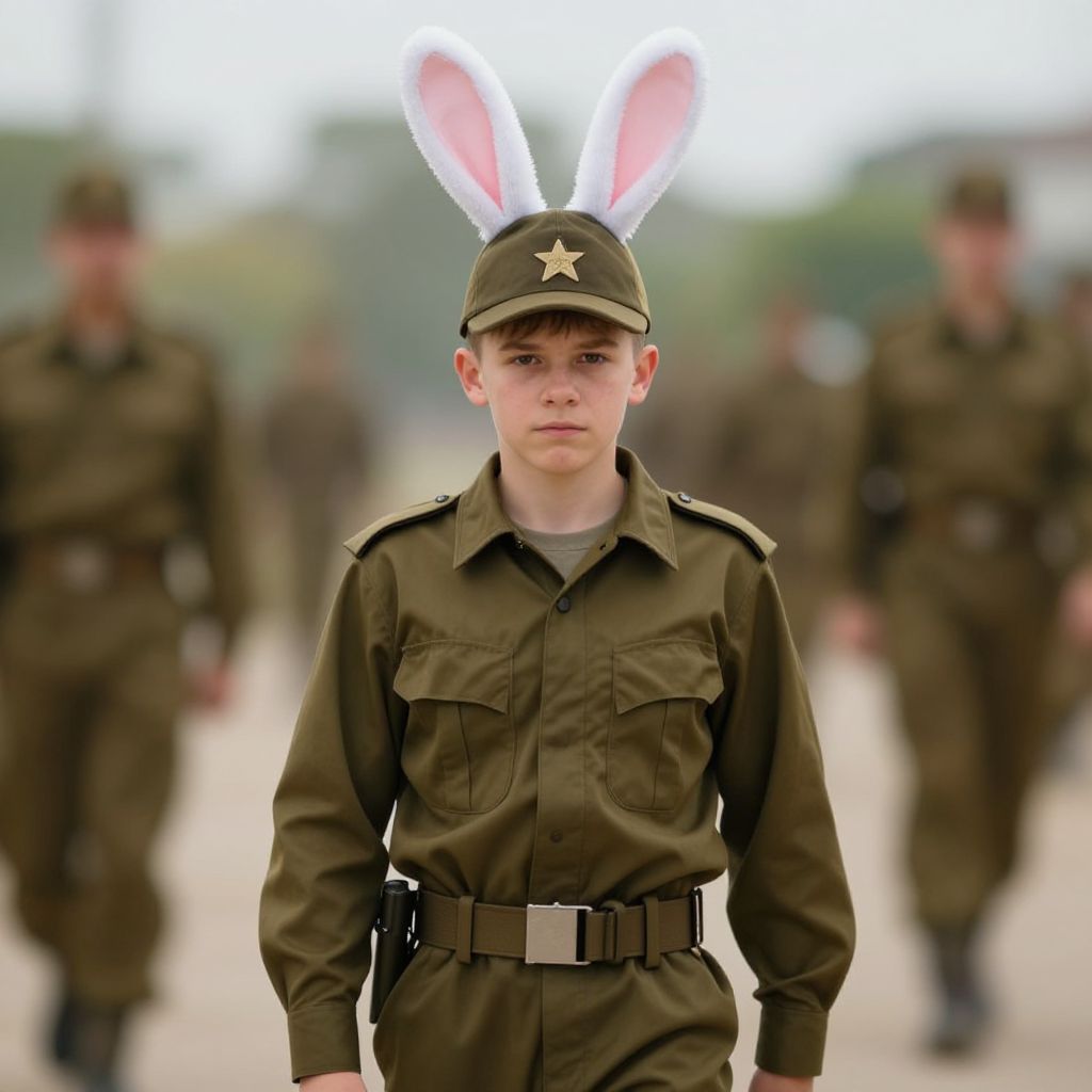 Funny hunting costume, 1boy, male focus, solo, realistic, blurry background, uniform, blurry, hat, belt, rabbit ears, military, looking at viewer