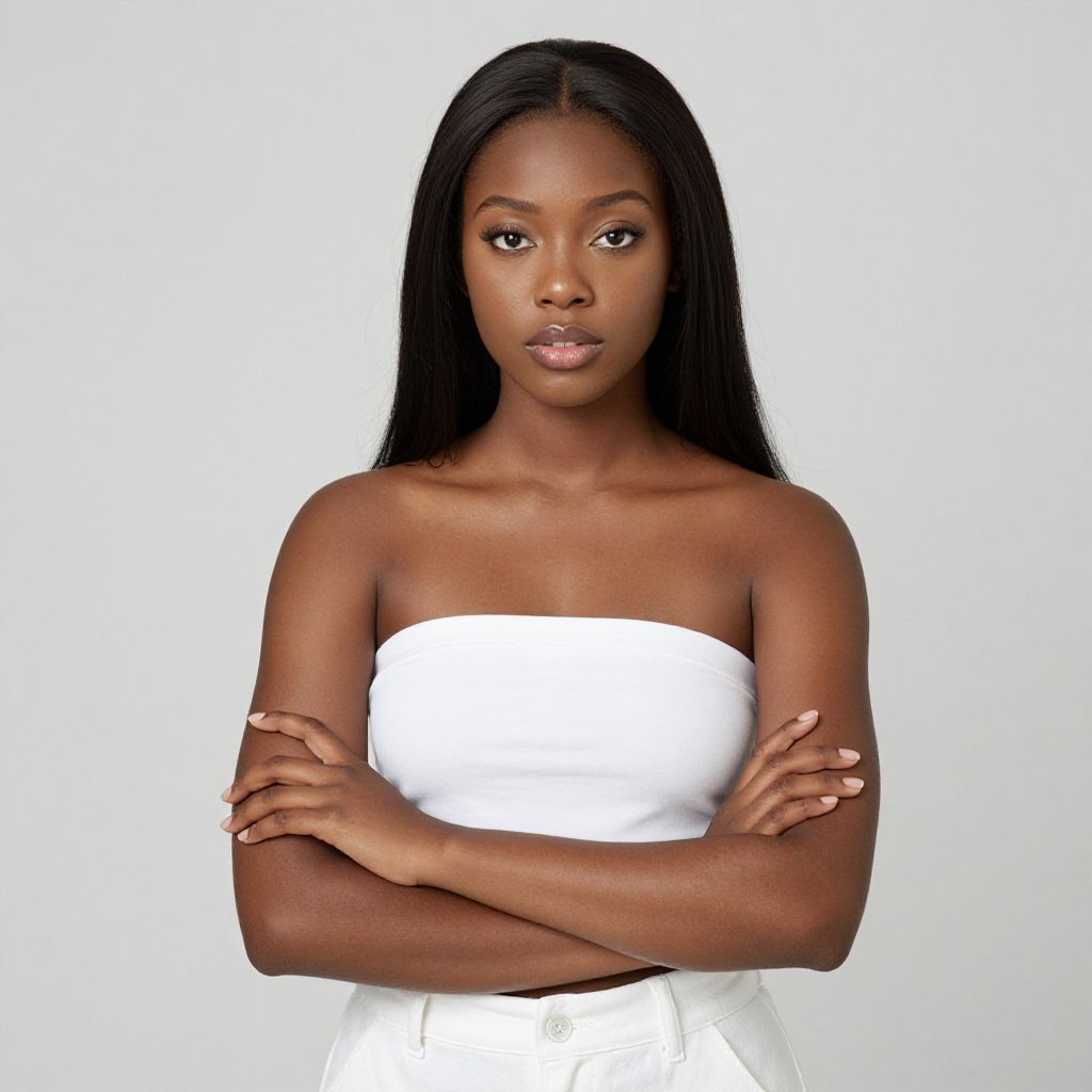 Photograph of a young Black woman with smooth dark skin and long straight black hair, standing against a plain white background. She has a confident expression, with full lips and dark, almond-shaped eyes. She is wearing a strapless white dress that contrasts with her skin tone and has her arms crossed over her chest. Her nails are manicured with a light pink polish. The image is well-lit with even lighting, highlighting her facial features and the texture of her dress. The overall composition is simple and focused on her, with a clean and minimalistic style.