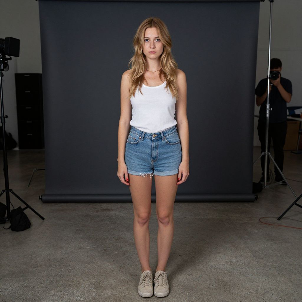 Photograph of a young woman with light brown, wavy hair standing against a dark studio backdrop. She has a fair skin tone and is wearing a white, sleeveless tank top, high-waisted, light blue denim shorts with frayed edges, and beige sneakers. She is looking directly at the camera with a neutral expression. The studio floor is gray concrete, and there are black stands with lights on either side of her. A person in the background, partially obscured, is holding a camera. The lighting is bright and even.