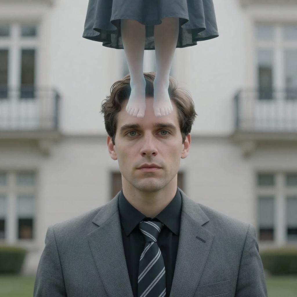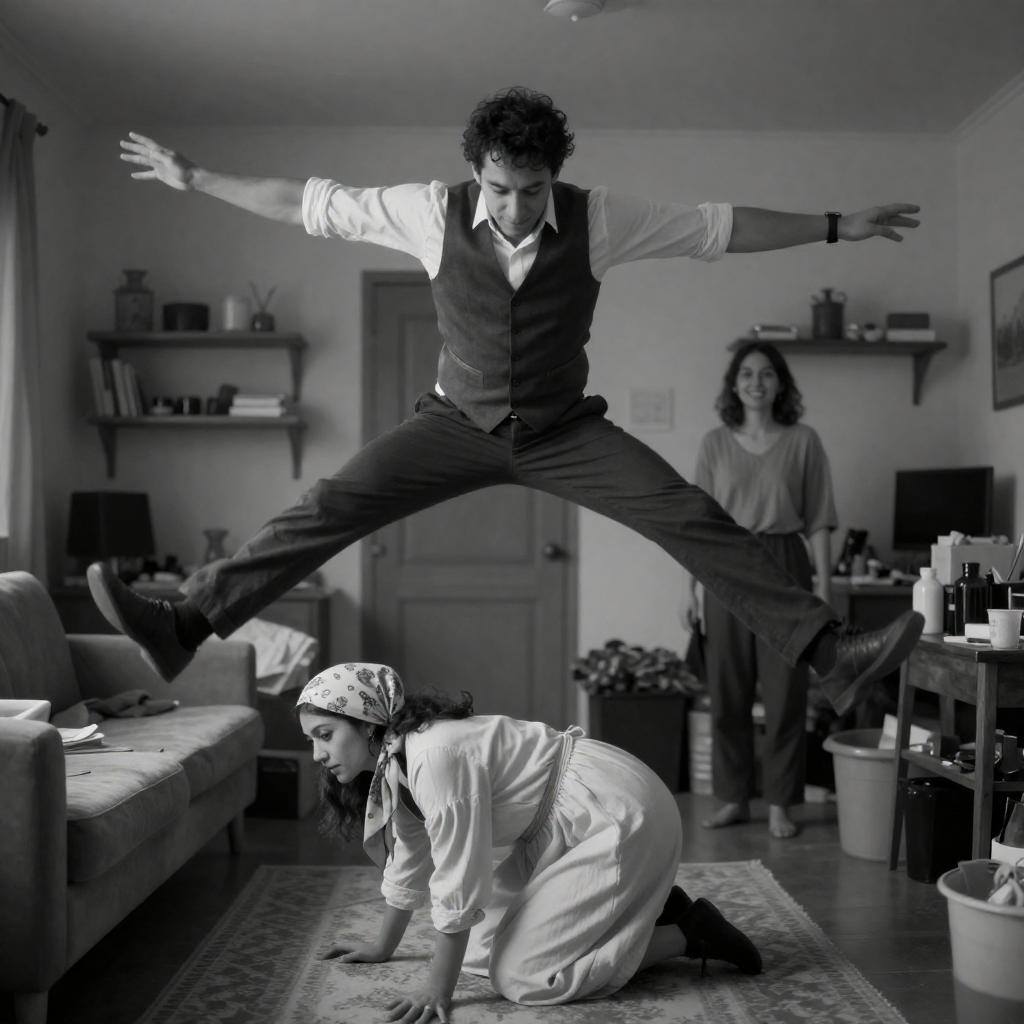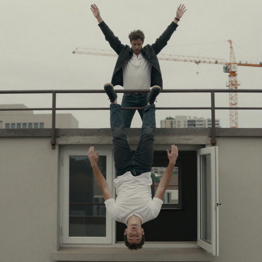 Photograph of two men on a rooftop. Upper man, with dark hair, black jacket, white shirt, raises arms, stands behind railing. Lower man, upside down, white shirt, dark pants, falls through open window. Background: cityscape, crane, cloudy sky. Upper man's expression: neutral. Lower man's expression: intense.
