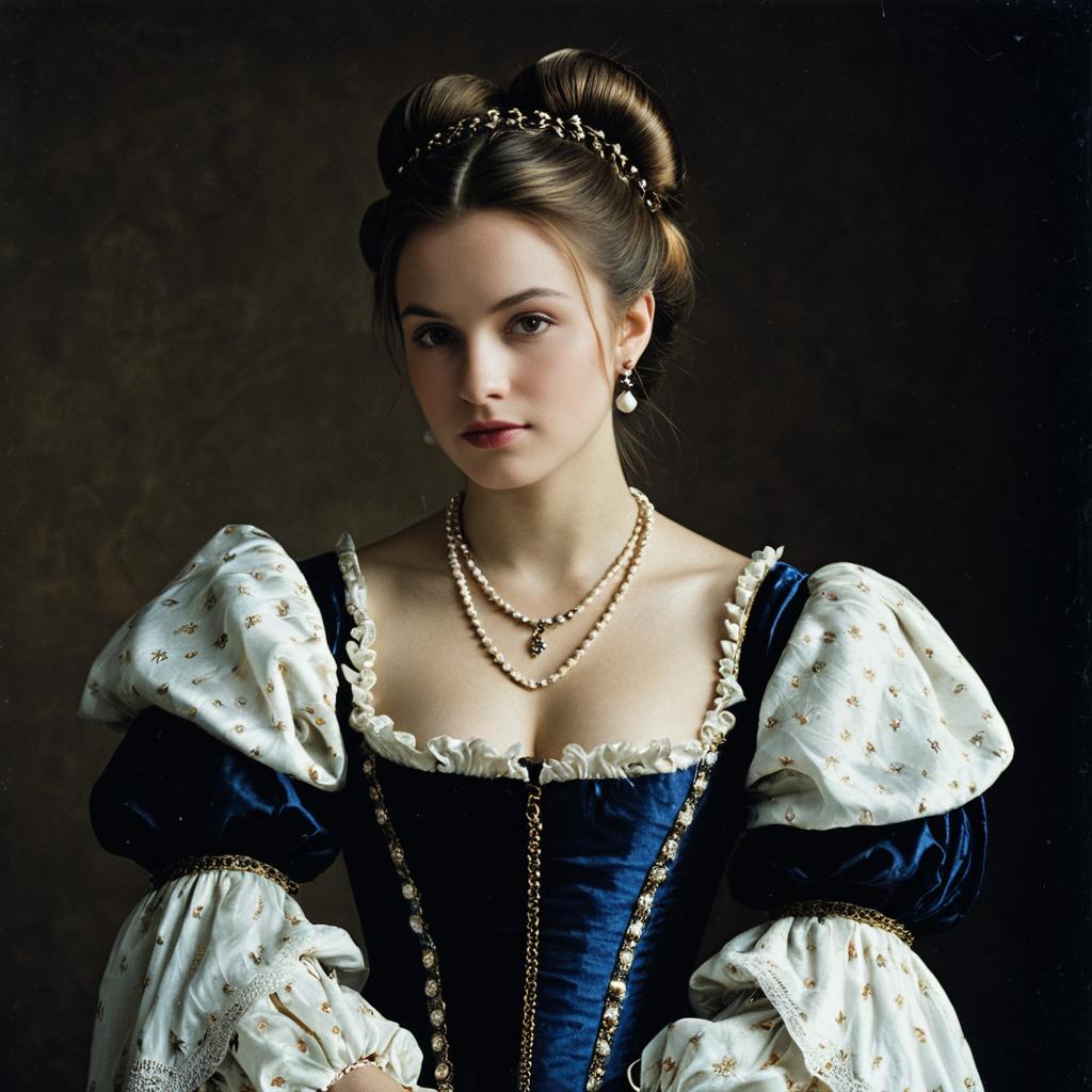 Portrait of a young woman wearing a British-style historical costume featuring a navy blue satin dress with white ruffled collar and puffy short sleeves. She has long brown hair styled neatly and brown eyes, posing with hands on hips against a plain, softly blurred background.