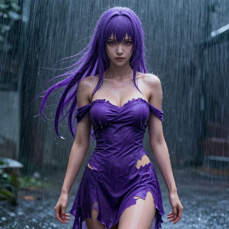 Digital artwork of a wet, purple-haired woman with large breasts in a tattered purple dress, walking in heavy rain, intense expression, dark, rainy