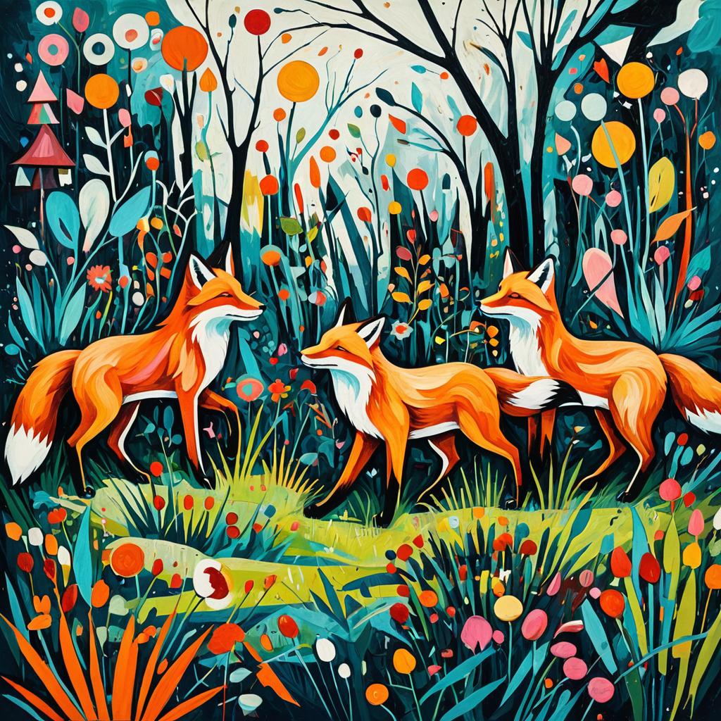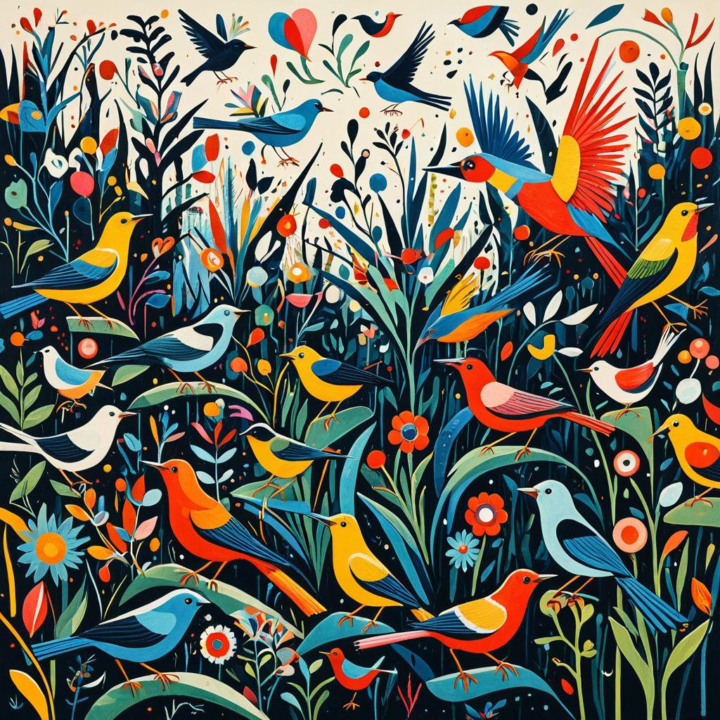 A surrealist-style garden of birds with vibrant and chaotic brushstrokes, playful and whimsical. High quality, abstract, colorful, energetic, cubist. festive mood with vivid tones, expressive and artistic, featuring surreal abstract shapes.