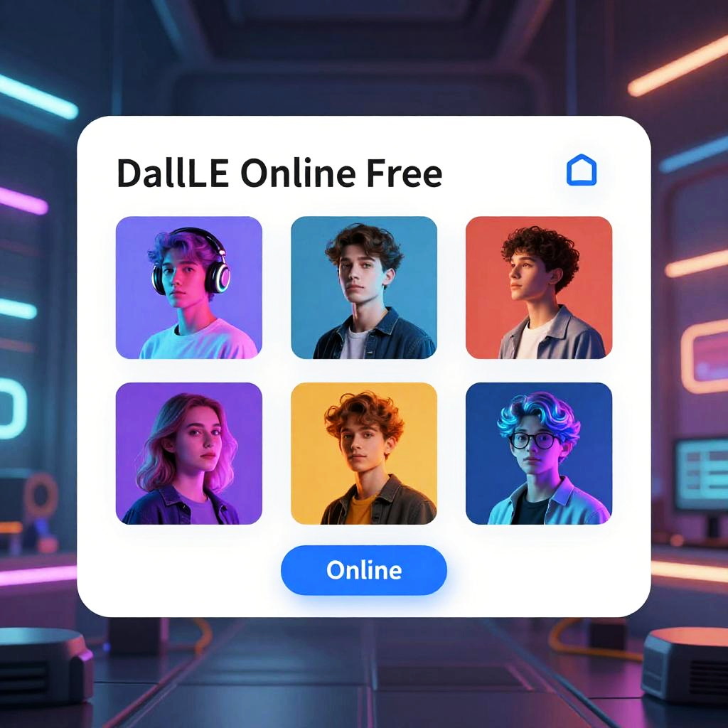 Dall-E online free interface showcasing a futuristic, sleek digital art generator with vibrant AI-created images, neon accents, and a user-friendly layout in a high-tech virtual environment, glowing softly under ambient lights.