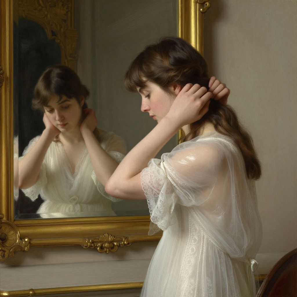 A photograph of a young Caucasian woman with fair skin and dark brown hair, styled in soft waves, standing in front of an ornate gold-framed mirror. She is wearing a delicate, sheer white dress with lace detailing on the sleeves. Her reflection shows her gazing downward, with her hands gently touching her hair. The background features a muted, beige wall, and the mirror's frame adds a touch of elegance. The lighting is soft, highlighting the gentle texture of her dress and the softness of her skin. The overall ambiance is serene and introspective.