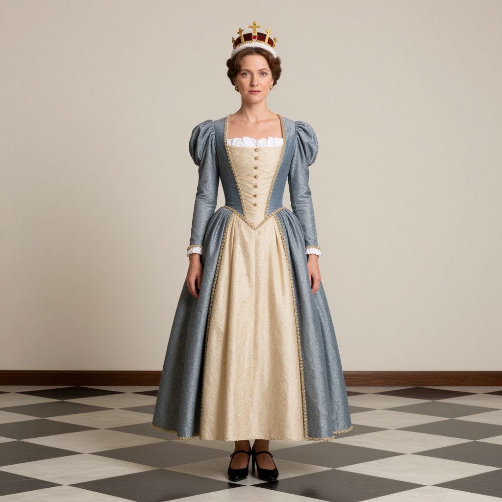 Mrs Potts Woman Costume, woman in a dress and crown standing on a checkered floor