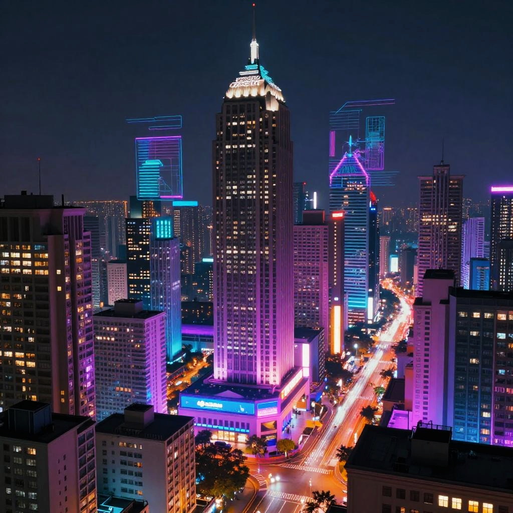 Nighttime cityscape photograph of a bustling urban skyline with brightly lit skyscrapers, neon lights, and colorful streetlights illuminating a busy road.
