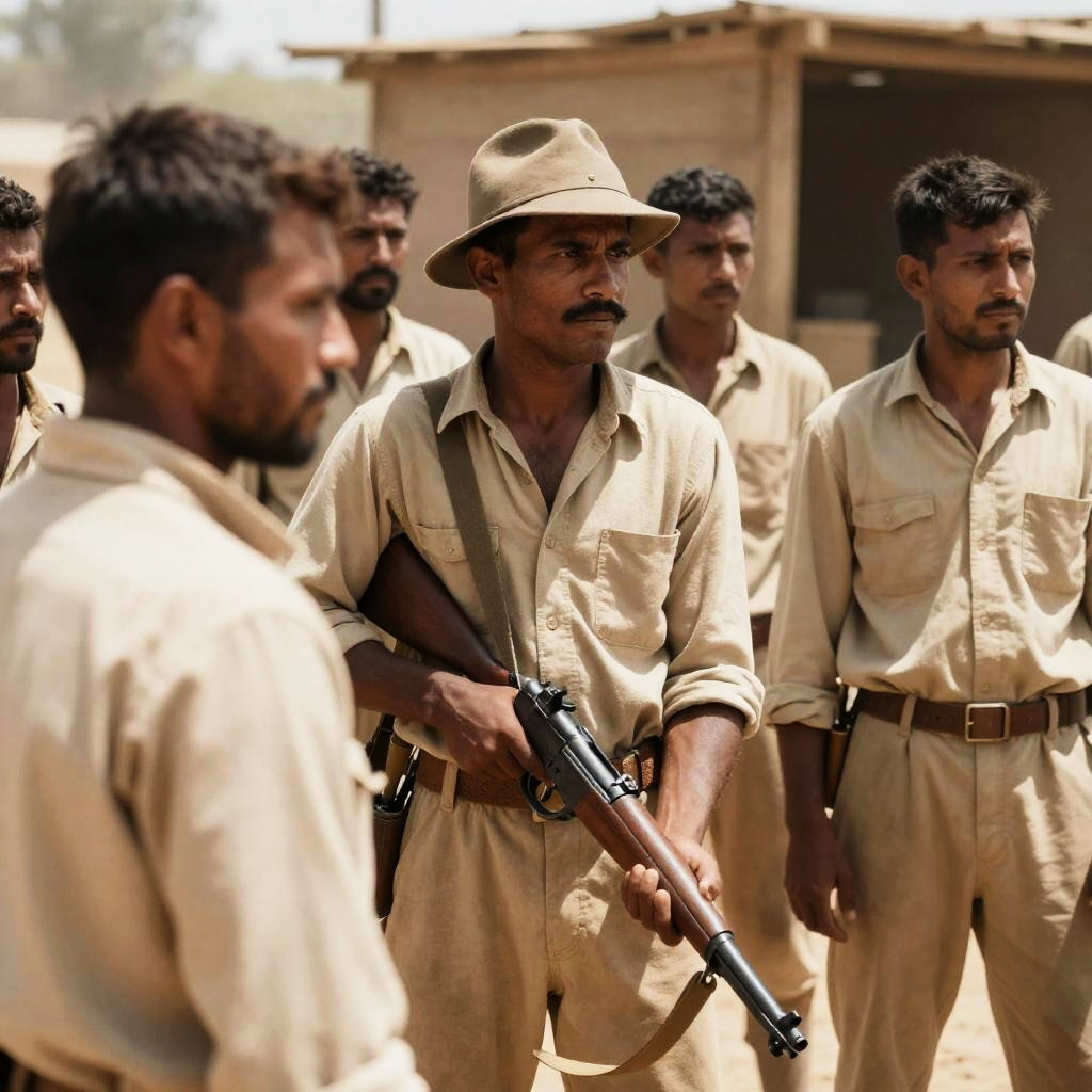 Black and white photograph of three men with rifles. Left man in uniform, serious expression, holding rifle. Middle man with mustache, white shirt, crouching, aiming rifle. Right man in white shirt, crouching, aiming rifle. Wooden box in center. Gravel ground. Background wall. Men focused on rifles.