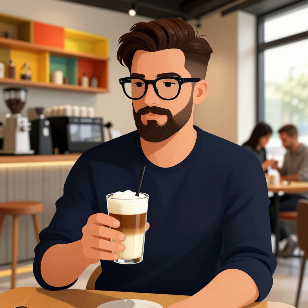 A stylish man with glasses and a neatly groomed beard is seated in a modern café, holding a glass of layered coffee with a straw. The warm ambiance highlights the colorful shelves and coffee equipment in the background, while another patron enjoys a drink near the window. The image features a digital art style with clean lines and vibrant colors, offering a contemporary and inviting café scene.