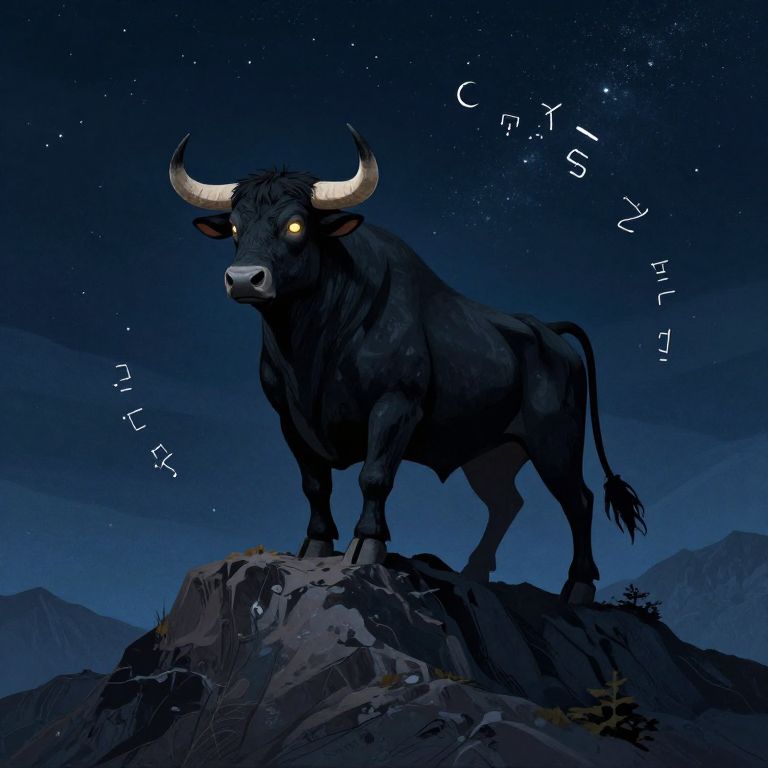 An artistic black bull symbolism illustration showing the black bull standing atop a mountain peak under a starry night sky, eyes shining with wisdom, surrounded by symbolic elements like the crescent moon and ancient glyphs, mystical and serene mood.
