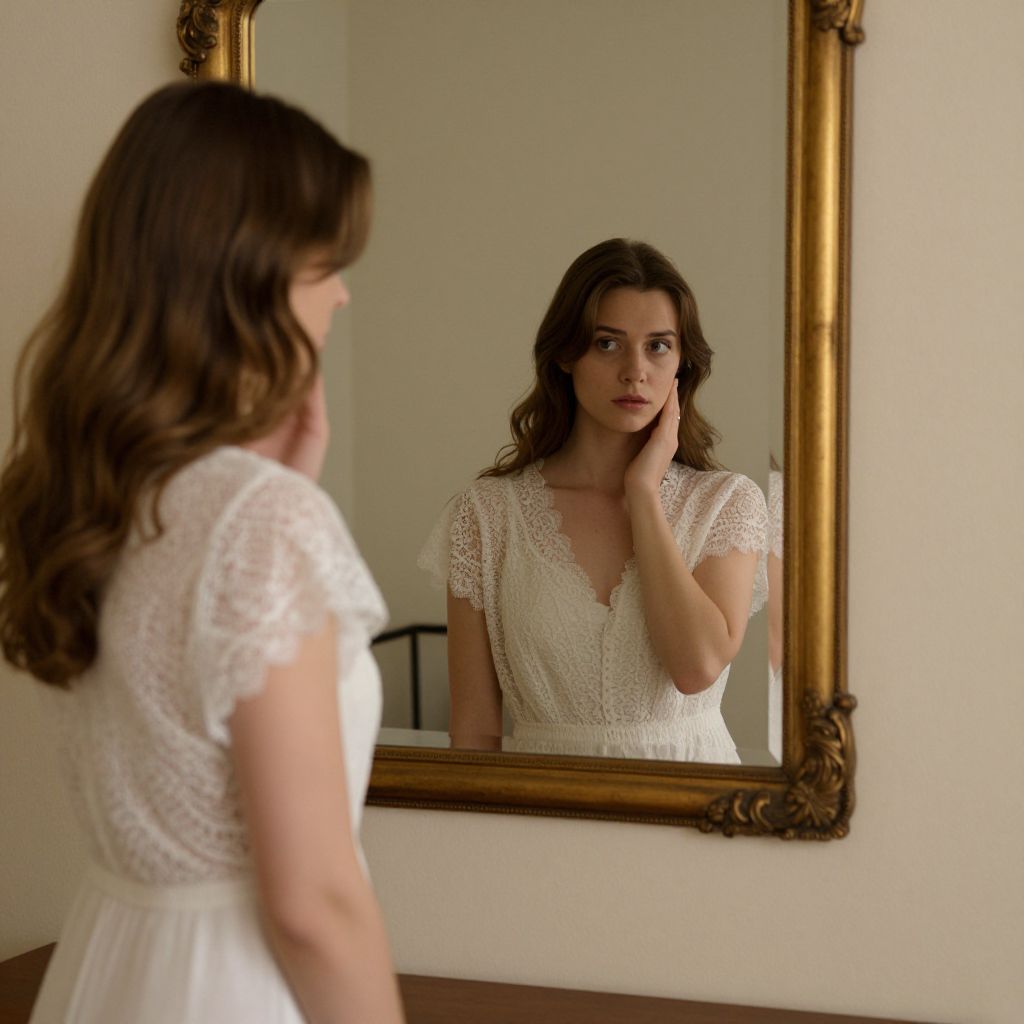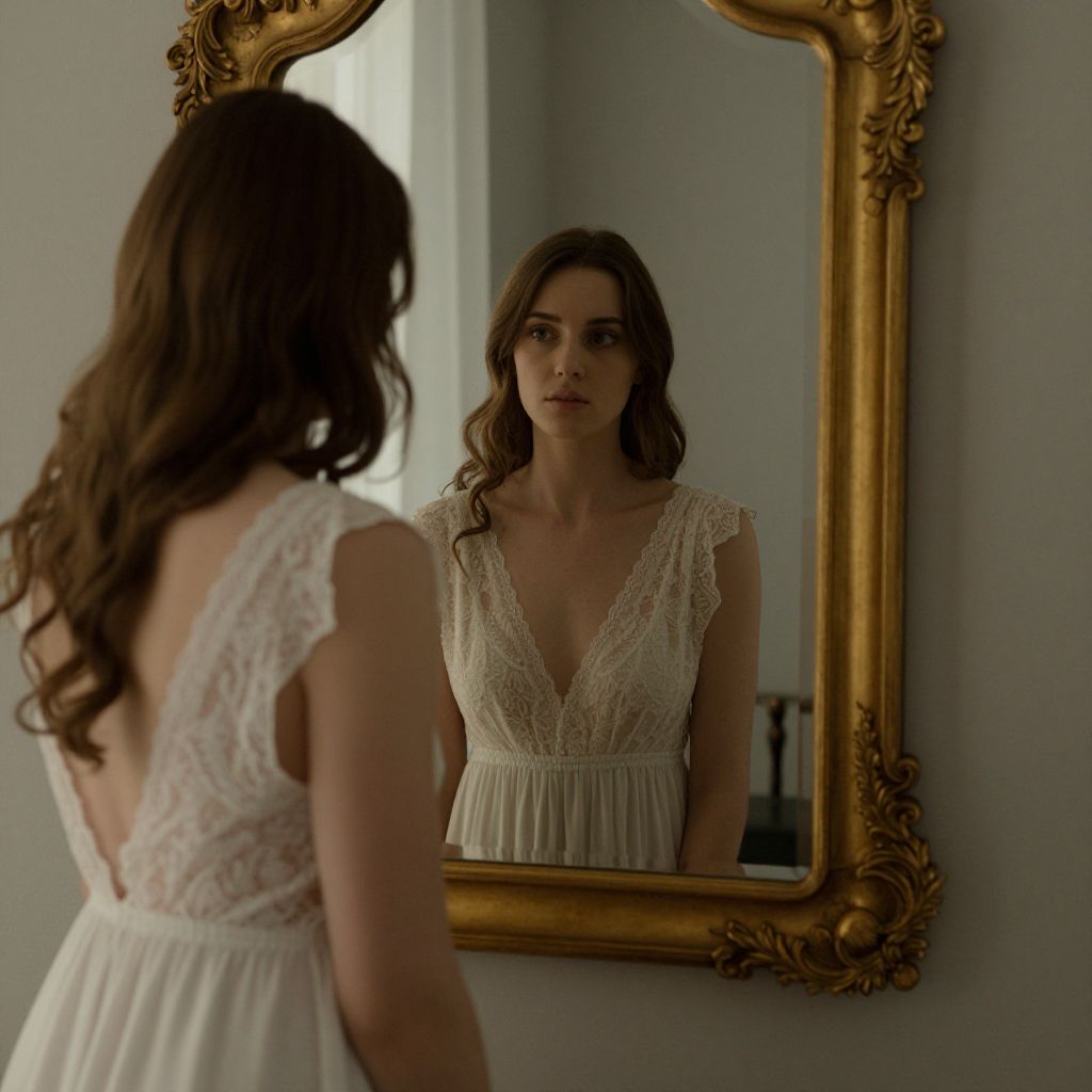 In a quiet chamber of self-reflection, a woman stands before a golden mirror, her gaze meeting her own in a dance of identity and introspection, where the soft texture of lace whispers of vulnerability and the stillness of the room echoes the silent dialogue between presence and absence.