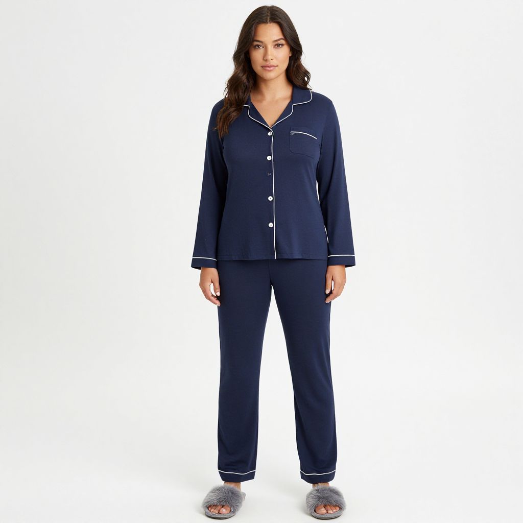 "Woman, casual loungewear, matching navy blue pajama set, white piping, button-up top with collar and chest pocket with logo embroidery, long sleeves, matching pajama bottoms with elasticated waist, straight leg, grey fluffy slippers, white studio background.. Sexy. Pretty face and beаutiful eyes. Big breasts."