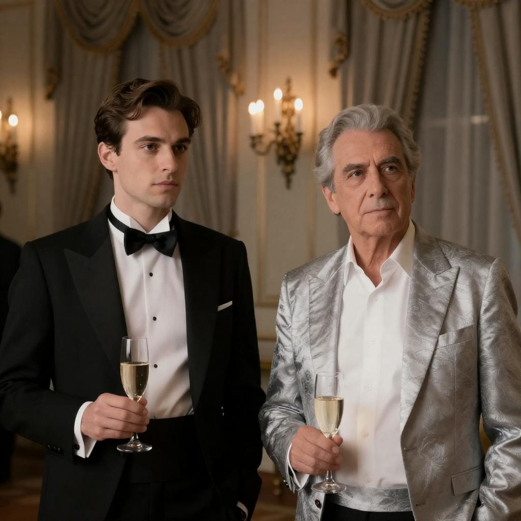 Photograph of two men in a diner. The younger man with short brown hair, black suit, and white apron stands left, looking at the older man. Older man with gray hair, black suit, and raised hand stands right, gesturing. Red Coca-Cola vending machine in background. Star-shaped accents. Light wood walls, awards on shelf. Both men wear black bow ties. Older man's facial expression is intense.