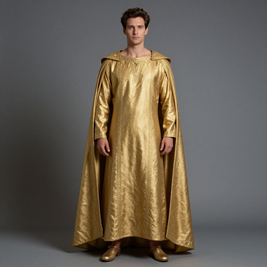 Midas Costume, man dressed in a golden robe and a golden cloak