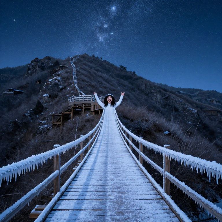 Photograph of a woman in a white dress with arms outstretched on a snow-covered wooden bridge, under a starry night sky with a hill