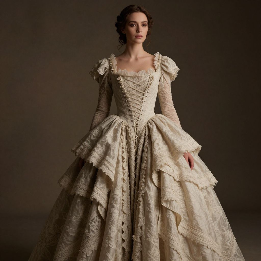 A woman in a beautifully detailed, lace-up dress with voluminous layers stands in a dramatic, soft-lit, highly detailed, cinematic setting.