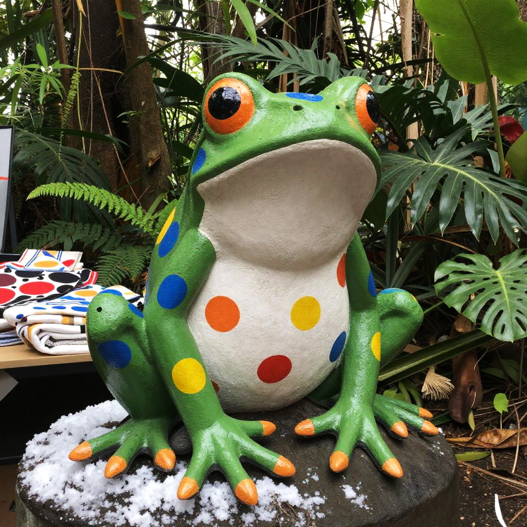 Textile garage sale trash polka art, dense tropical rainforest, colorful tree frog sculpture, Winter