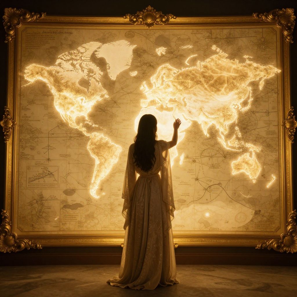 A woman in a flowing robe stands before a luminous, golden-framed map that glows with ethereal light, her hand tracing its contours as if summoning forgotten worlds from the depths of her imagination.