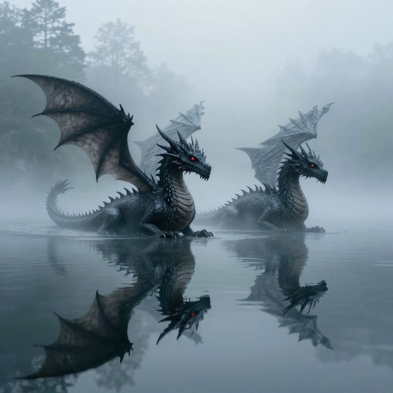 Two ethereal, twin-headed dragons with piercing red eyes and spiky dorsal fins glide serenely across a misty, reflective lake, their mirrored forms creating an otherworldly illusion in a forest shrouded in enigmatic fog.