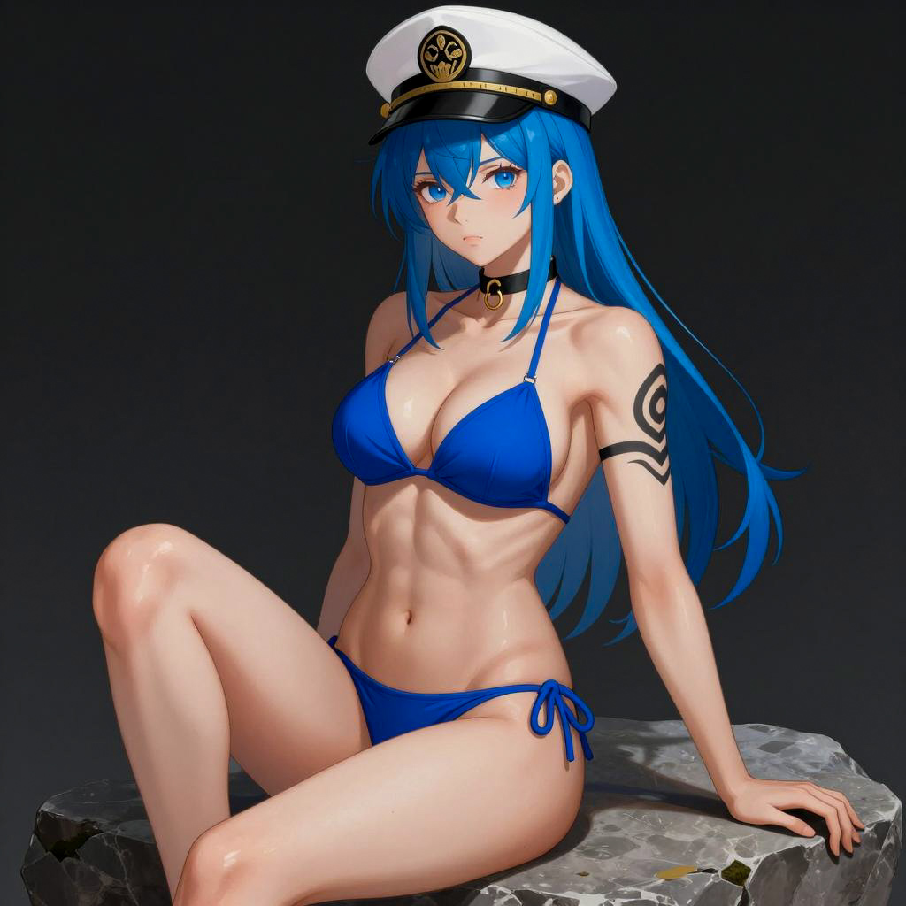 Digital illustration of a blue-haired anime woman with long hair, wearing a blue bikini, white naval cap, black choker with a small gold ring. She has a black tribal tattoo on her right upper arm. Sitting on a gray rock, legs crossed, arms resting on the rock. Dark background. Her facial expression is neutral. One visible eye, blue. Her body is muscular with visible abs and large breasts. Her skin is pale. The cap has a black emblem on the front.