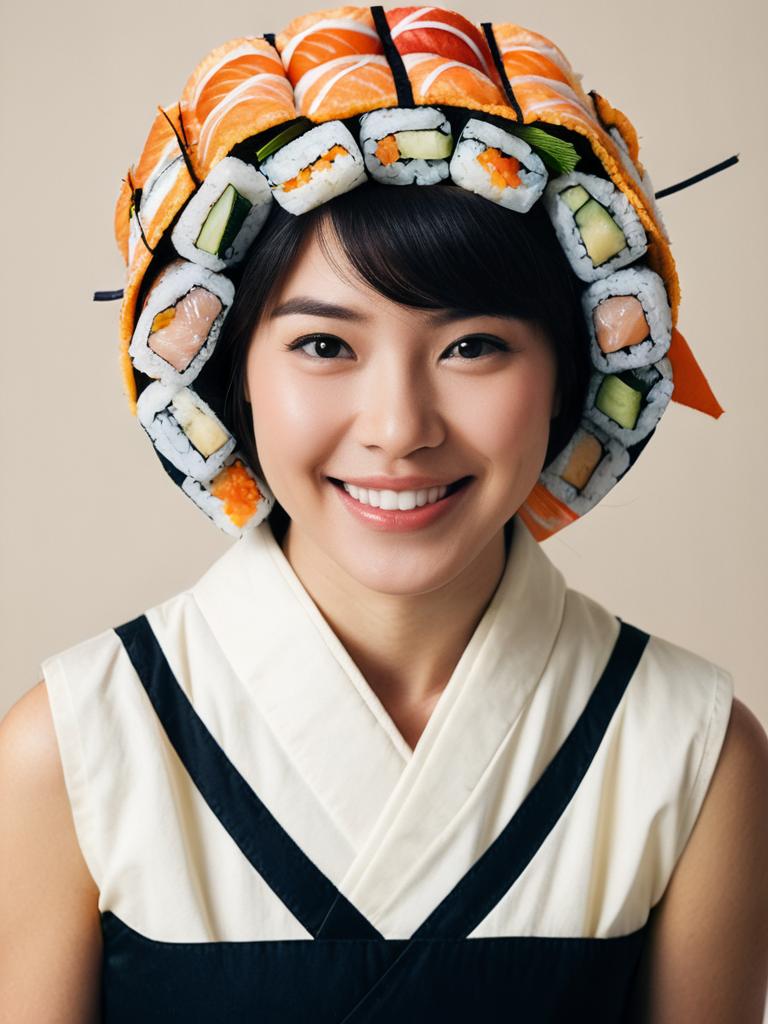 Person in Sushi Roll Costume, close-up cheerful headshot with sushi hat --sref 1400