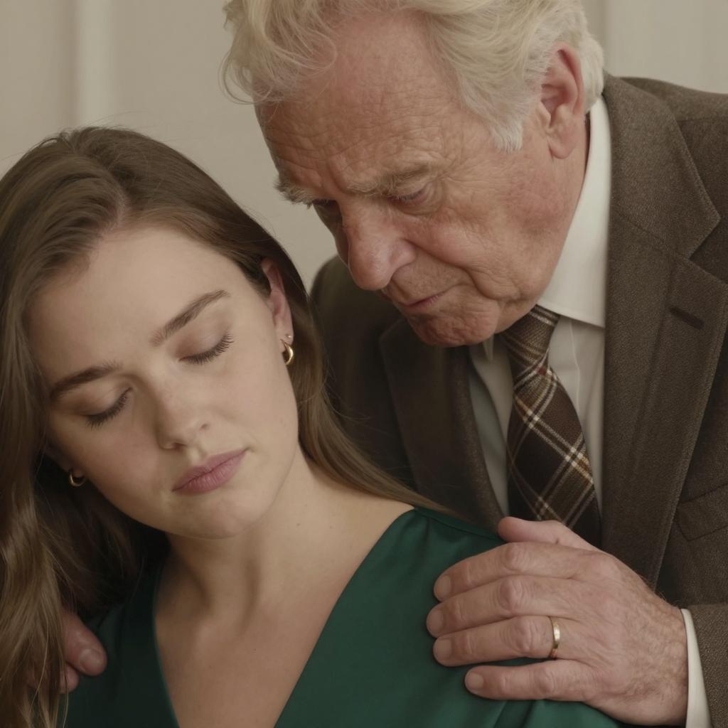 Two women in a dimly lit room. The younger woman with dark hair in a bun, wearing a white short-sleeve blouse, sits on a chair, smiling at the older woman. The older woman with blonde hair, wearing a red blouse and holding papers, stands next to her. Sunlight filters through a window in the background.