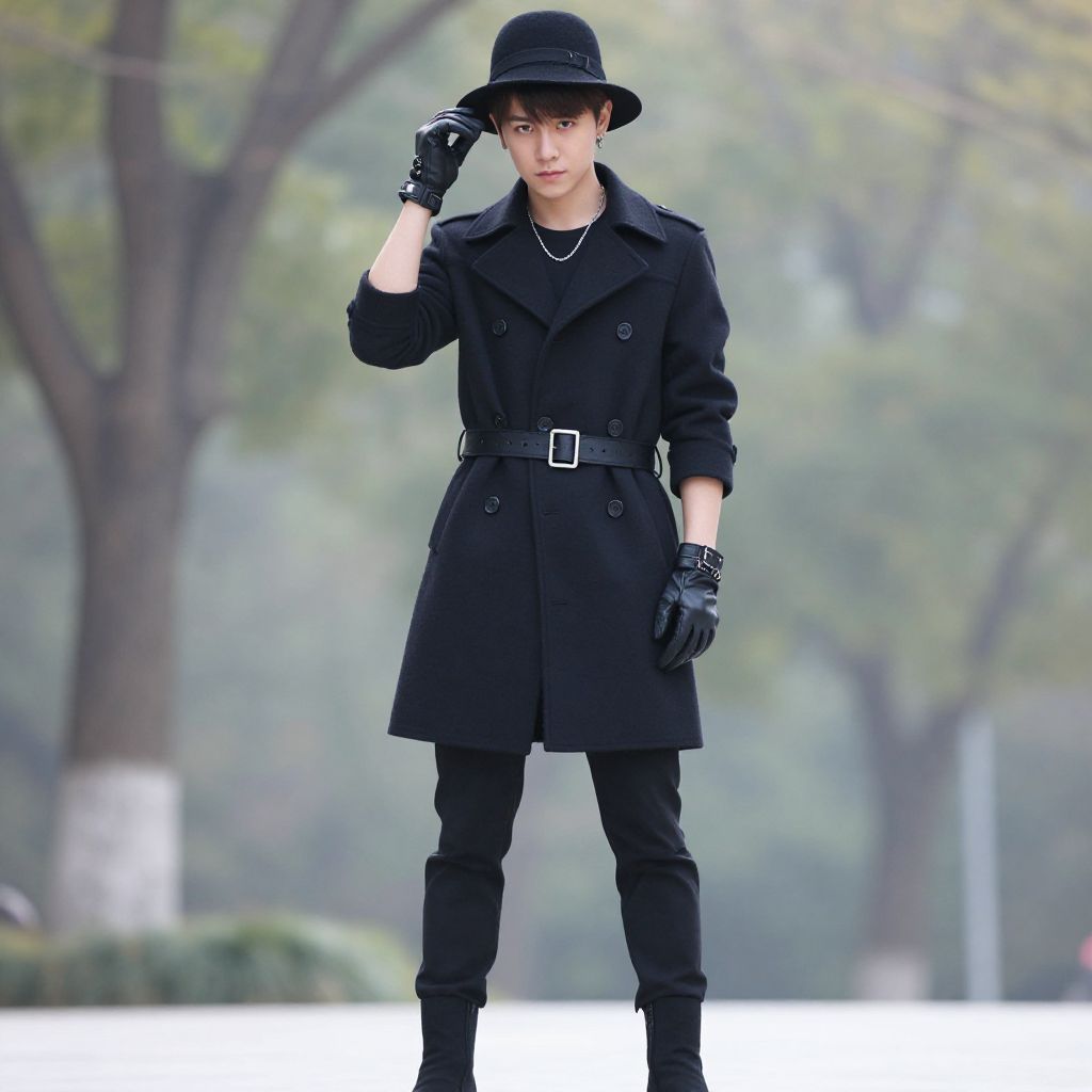 "nemuri kayama costume, 1boy, solo, male focus, hat, outdoors, tree, looking at viewer, full body, standing, jewelry, day, boots, pants, korean clothes Realistic photo of casual sexy person with pretty face"