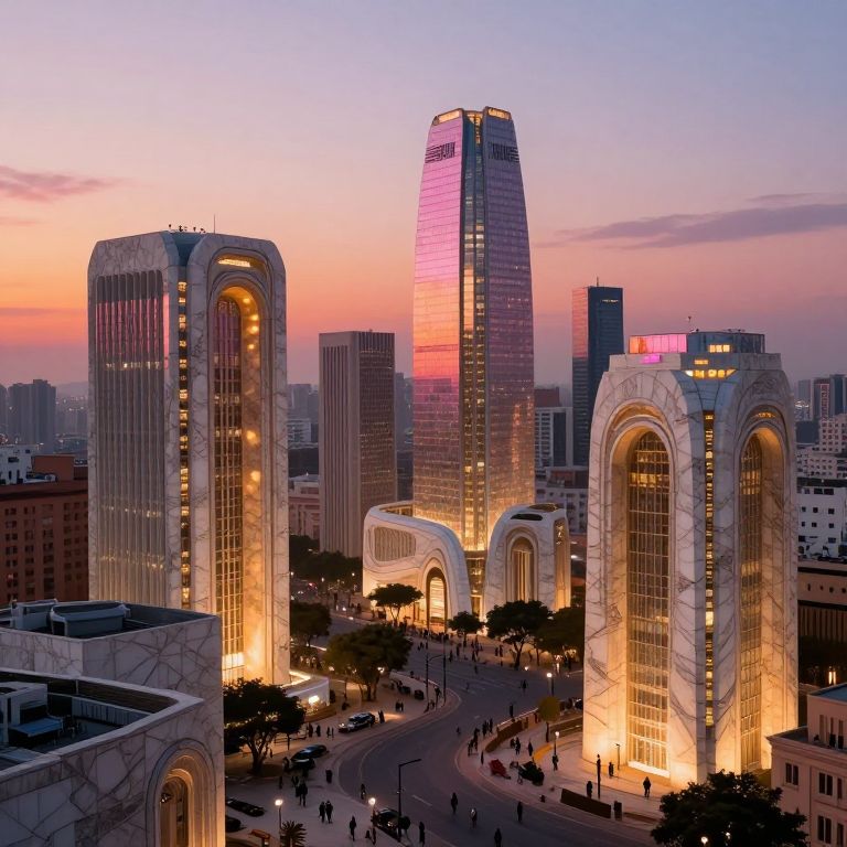 Marbel cityscape at sunset, glowing marble buildings reflecting pink and orange hues, intricate stone textures, futuristic yet ancient vibe, detailed streets bustling with silhouettes, soft ambient lighting, ultra-realistic style