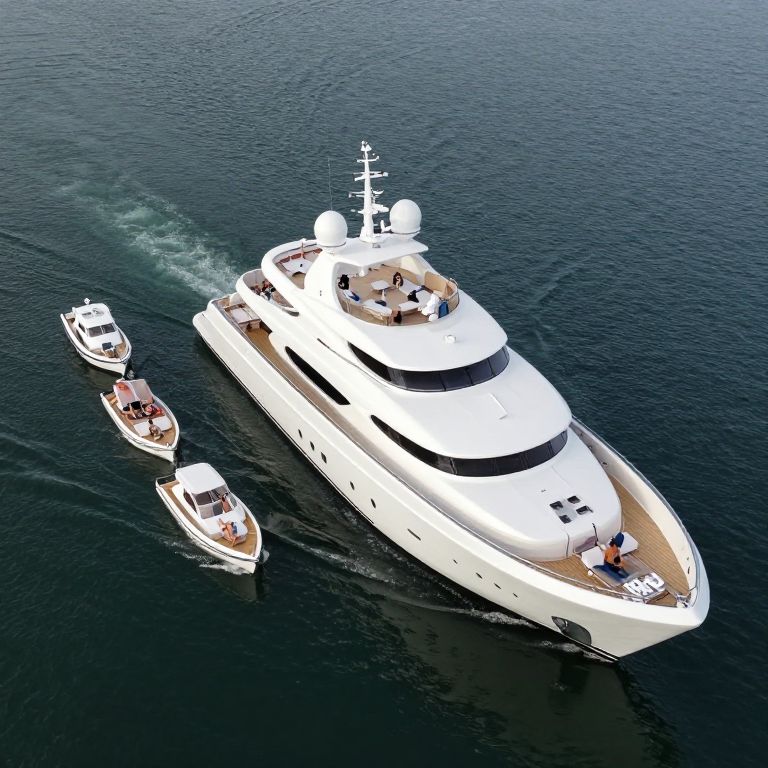 Aerial view of the luxurious superyacht Trending cruising through calm waters, accompanied by three smaller watercrafts positioned to its left, while passengers relax on its spacious decks and sun loungers.
