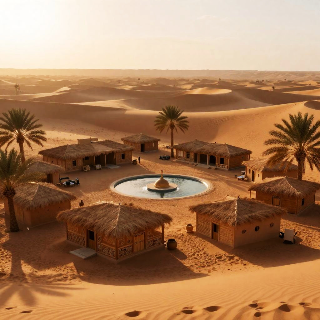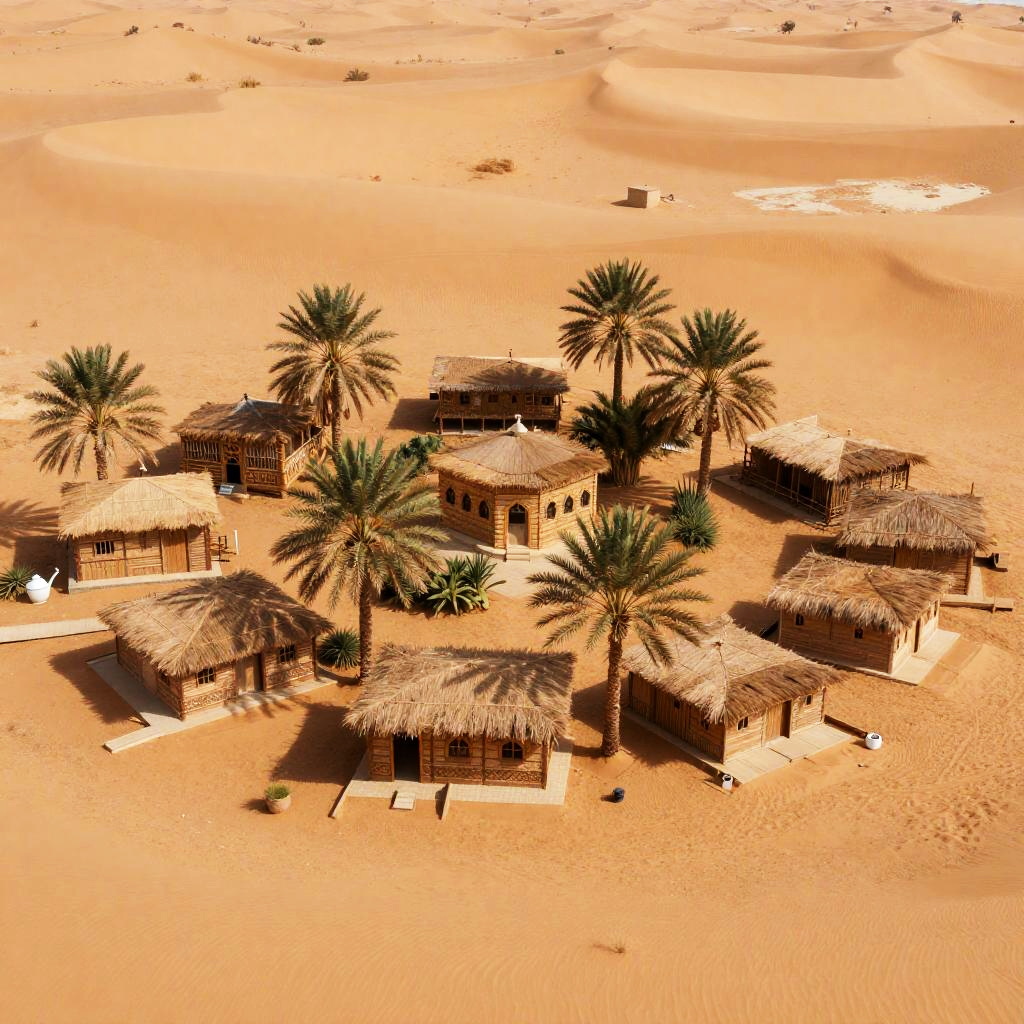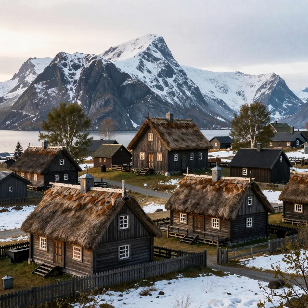 Photorealistic image of a traditional Nordic Viking village featuring intricately detailed wooden houses with thatched roofs. The village is set in a rugged landscape with snow-covered ground and surrounded by towering, snow-capped mountains. Soft, warm lighting from the low sun casts a gentle glow over the scene. Tall trees are interspersed among the houses, enhancing the natural and historical atmosphere.