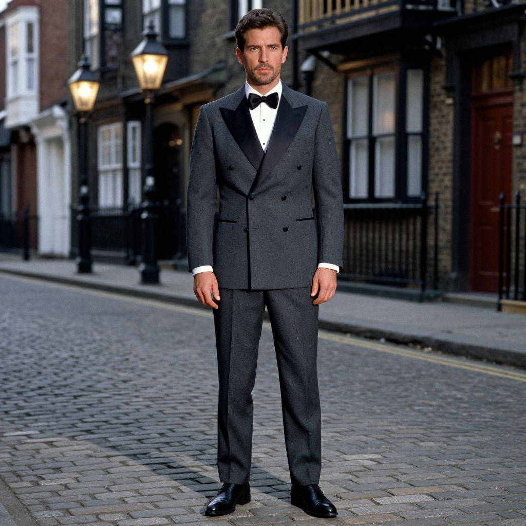 A man, charcoal gray double-breasted tuxedo, peak lapels, white poplin dress shirt, black satin bow tie, tailored charcoal trousers, black leather derby shoes, cobblestone streets, Victorian architecture, gas lamps glowing, AgfaColor film, confident expression. Man has masculine face and piercing eyes