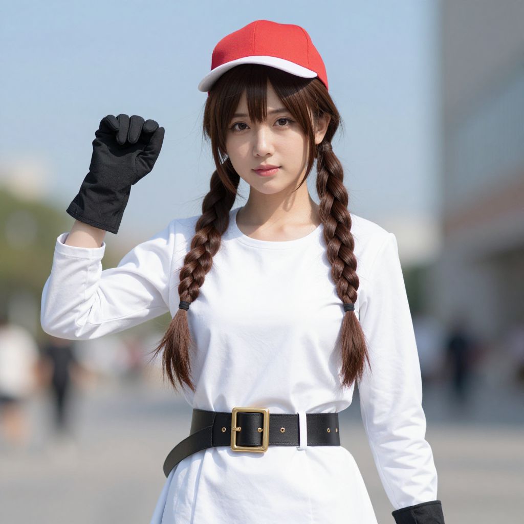 Girl cruella vil costume, belt, braid, blurry background, looking at viewer, 1girl, brown hair, asian, hat, realistic, twin braids, blurry, solo, gloves, long sleeves, day, solo focus, outdoors, blue sky