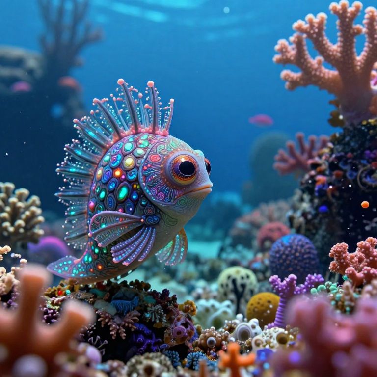 Vibrant digital illustration of a colorful, iridescent fish with glowing spots, swimming among a diverse, vibrant coral reef in a deep blue underwater