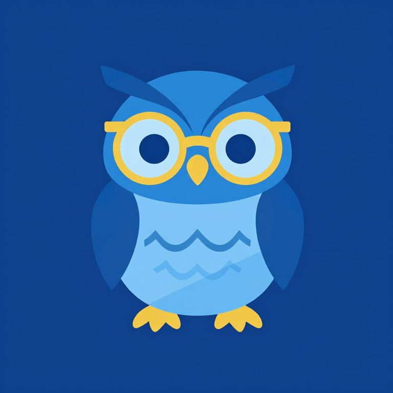 This is a digital illustration of a cartoon owl set against a solid dark blue background. The owl is predominantly blue with lighter blue on its chest and belly, featuring a simple wavy pattern. It has large, round, yellow-framed glasses with black centers, giving it a nerdy appearance. The owl's beak is small and yellow, matching its feet and eyebrows. Its eyes are large and black, adding to the cartoonish and expressive look. The owl's wings are dark blue and slightly rounded. The overall style is flat and minimalist, with bold colors and simple shapes, evoking a playful and friendly vibe.