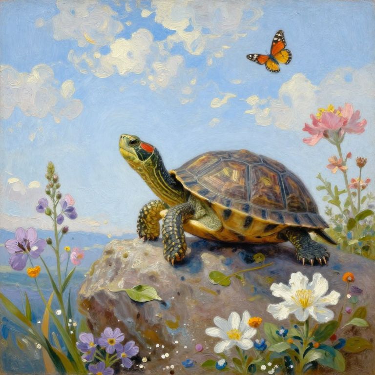 Une tortue contemplative sur un rocher, entourée de fleurs exotiques et papillons, ciel bleu clair avec nuages doux, style peinture impressionniste avec textures fines