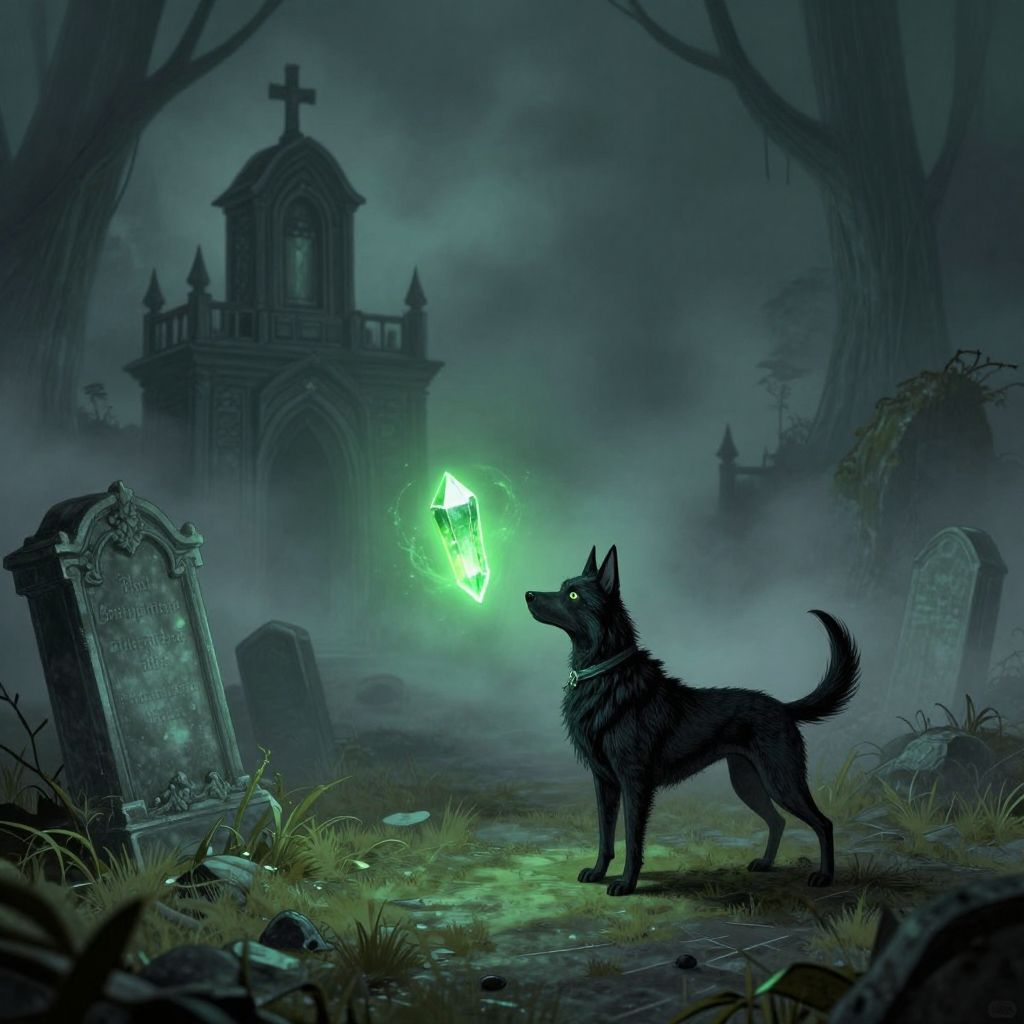 Digital artwork of a black, bipedal dog-like necromancer casting a dark spell with a glowing green crystal in a foggy, eerie cemetery. The scene features old gravestones and a gothic mausoleum in the background, enveloped in thick mist and dark, muted tones for a mystical and supernatural atmosphere.