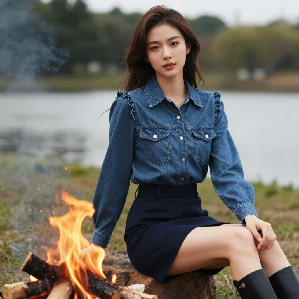 A athletic woman in a light grey ribbed knit sweater and distressed blue skinny jeans stands by a beach bonfire with lanterns, embodying the vibrant visual style of Kodansha comics. She wears stud earrings and light makeup, enjoying the warm glow of the fire. Sexy. Pretty face and beutiful eyes