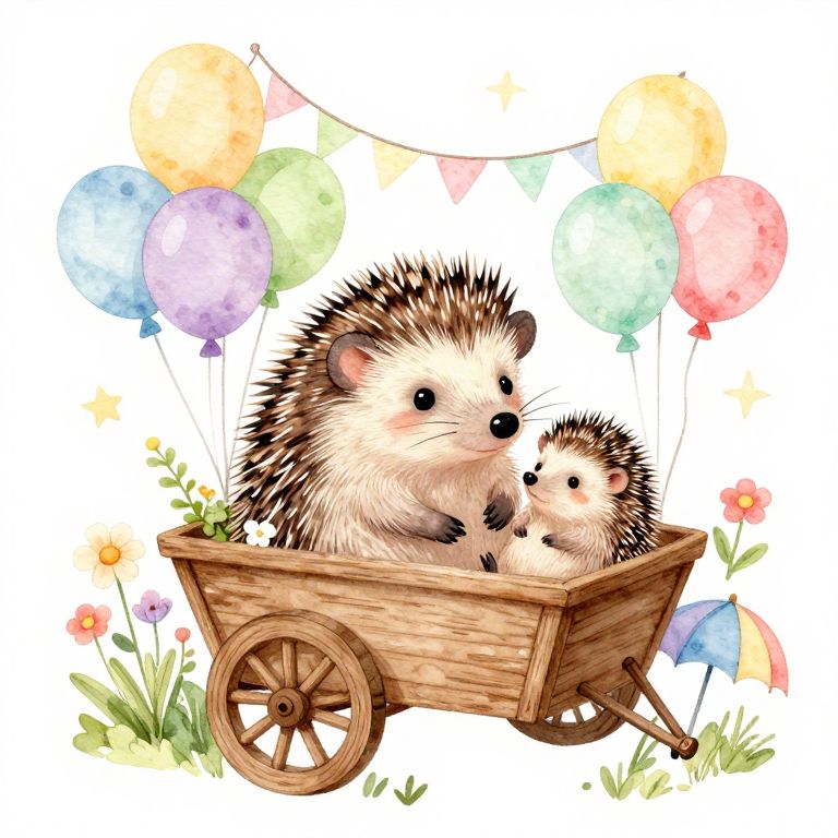 Watercolor illustration of two cute hedgehogs in a wooden wheelbarrow, surrounded by colorful balloons and flowers, with a festive string of flags above