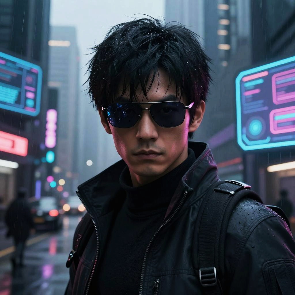 Pasdar character portrait, rugged and determined face with cybernetic enhancements, wearing tactical gear with intricate details, neon cityscape background with holographic ads, moody and dramatic lighting, digital art style