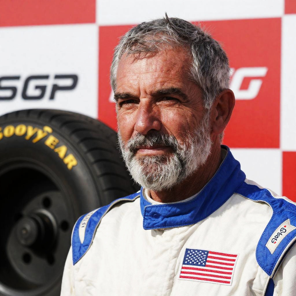 Photograph of an older man with gray beard and hair, wearing a white racing shirt with blue stripes, and an American flag patch on the left shoulder. Tire with "Goodyear" visible on the left. Background includes a red and white racing poster. Man's face shows a slight smile. Bright daylight.