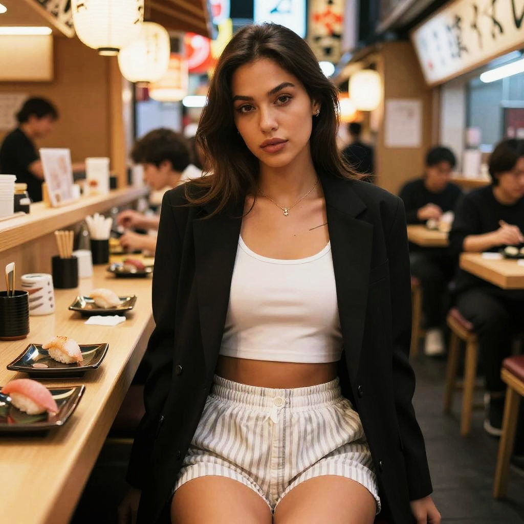 A toned woman in casual streetwear, wearing a white cropped tank top and a black longline blazer, paired with mid-rise striped shorts in white and grey. She has minimalist tattoos on her arm and an understated necklace, seated in a sushi bar in a Tokyo alleyway, surrounded by vibrant neon lights and bustling energy. Sexy. Pretty face and beutiful eyes