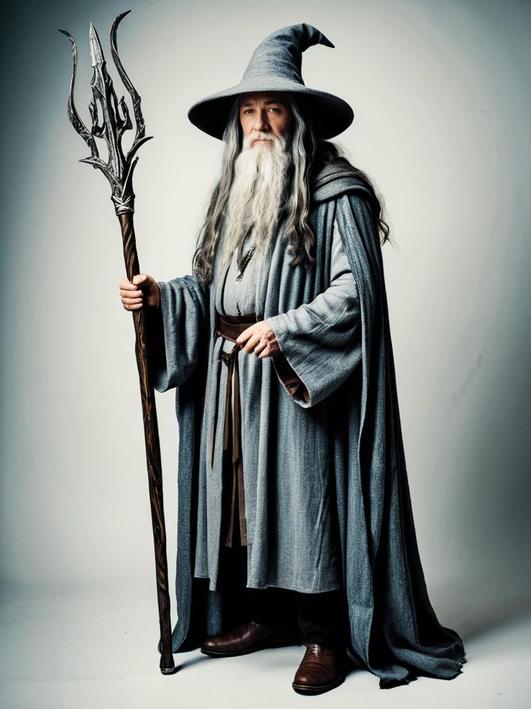 Man in Gandalf costume, full-body cosplay photo with staff prop, photorealistic tones