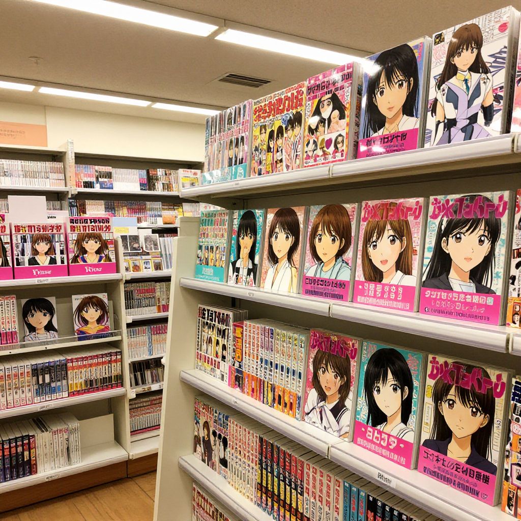 A wide-angle shot of a modern anime-inspired bookstore in Shinjuku, with shelves filled with manga bound in bright pink and turquoise covers, each displaying tokyopop style artwork—exaggerated facial expressions, exaggerated proportions, and vibrant color palettes—focusing on a young woman with brown hair and warm, curious eyes browsing the shelves in a warm, dimly lit interior with soft fluorescent lighting.