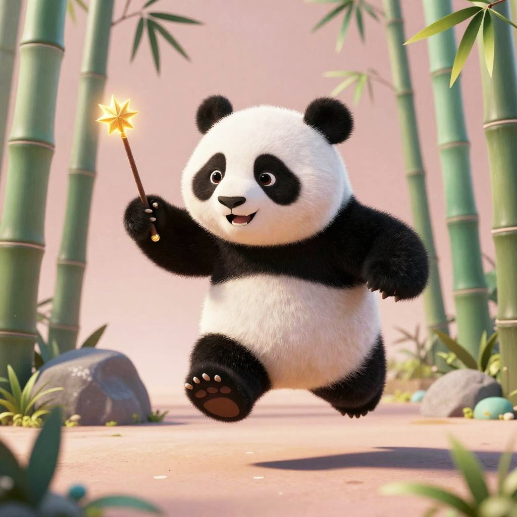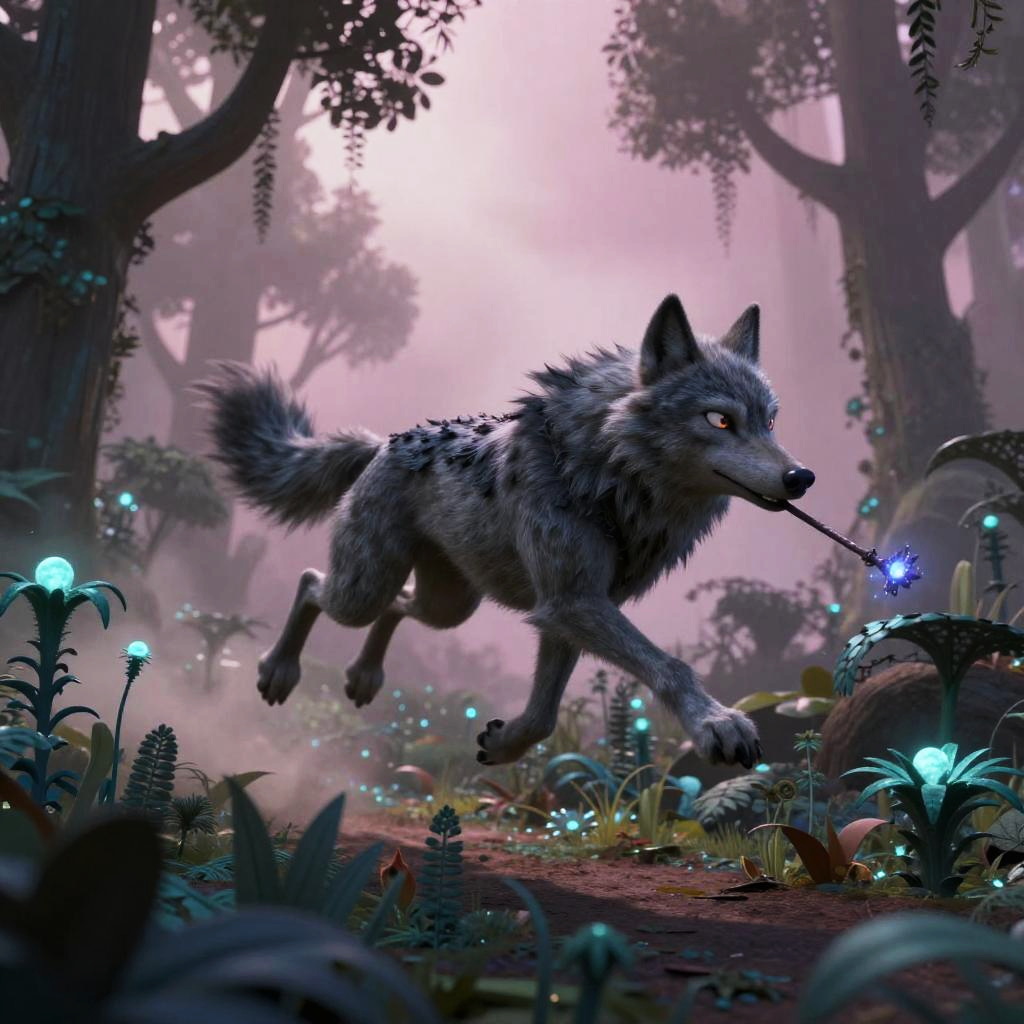 Mysterious shadowy wolf holding a magic wand, running fast and flying through the air in a garden, trees and plants made of dark enchanted forest, realistic 3D animation, dusty pinks and teals