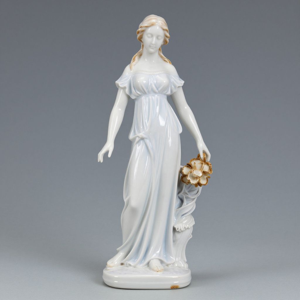 Photograph of a white ceramic statue of a classical-style woman with flowing gown, holding a bouquet of flowers, standing on a base, against a gray